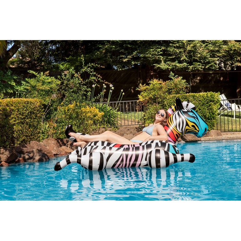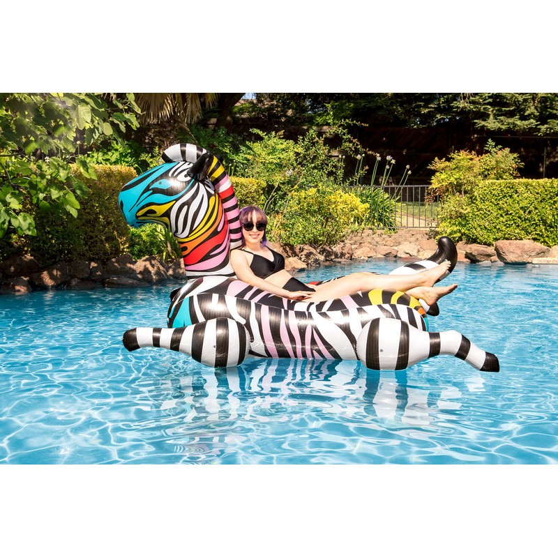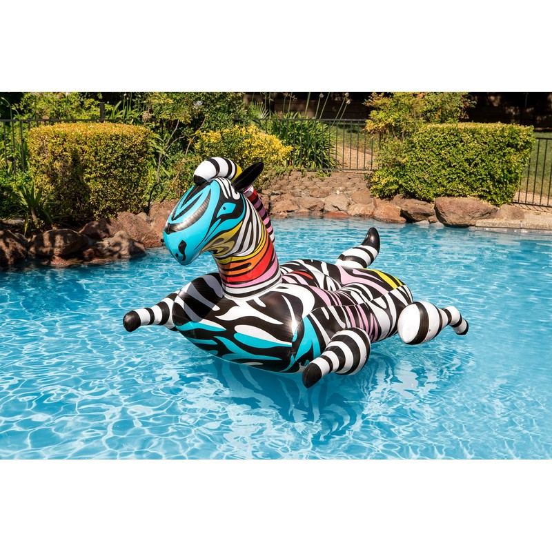- Pool ride-on measures 6-feet long and 5-feet wide and is full of personality in a rainbow zebra design