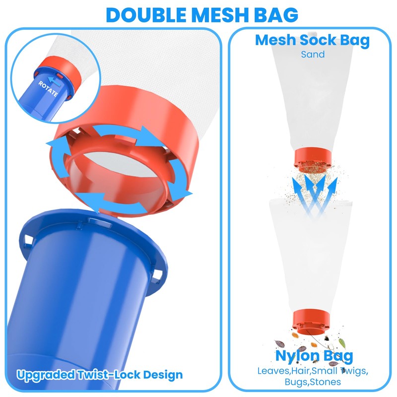 - Upgraded Spa Jet Vacuum: Connects to a standard garden hose (not included) for strong suction—no electricity needed. Features an upgraded twist-lock design for the debris collection bags, ensuring a secure fit that won’t come loose during use