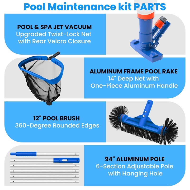 Poolvio Pool Cleaning Kit with Spa Jet Vacuum Cleaner, 8-Foot Pole, Leaf Rake Net & Round Brush for Inflatable and Above-Ground Pools