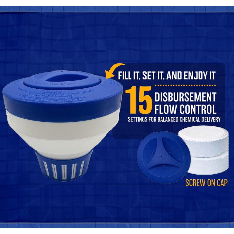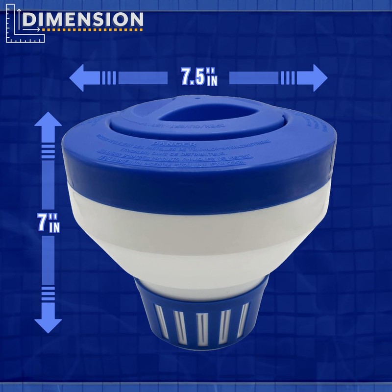 - 💧【Dimensions】This deluxe chlorine feeder measures 7” tall and 7.5” wide. It can fit up to 4 tablets ranging from 1” wide to 3” wide. The beautiful blue and white design will look perfect in your pool.