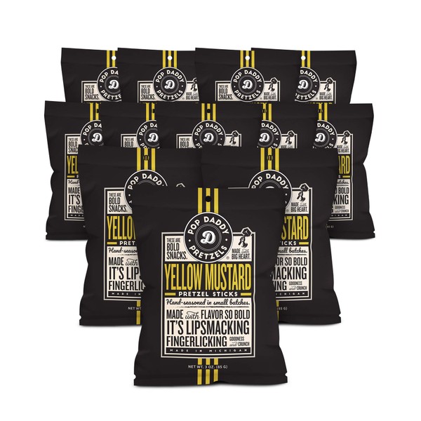Pop Daddy Yellow Mustard, 3oz Snack Size Gourmet Flavored Pretzel Sticks (12 Pack)