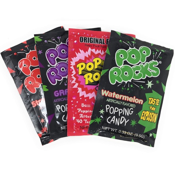 - Includes 20 - 0.33 oz Packets Of Pop Rocks Popping Candy Assorted Flavors. Strawberry, Cherry, Watermelon, Grape