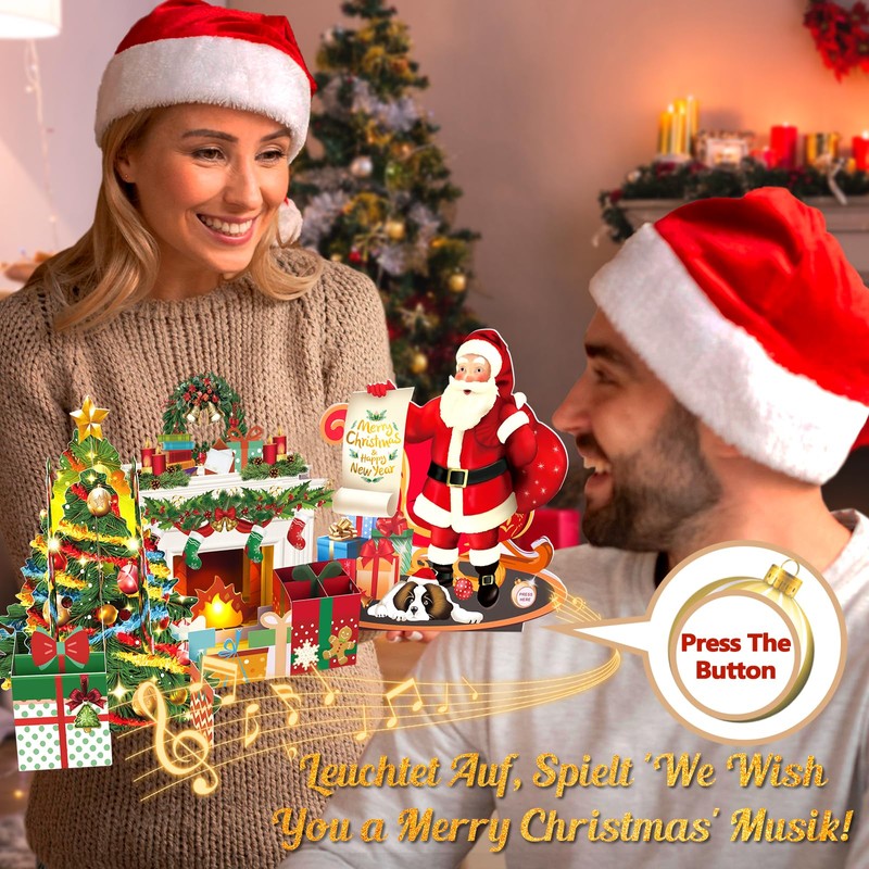 - A 3D pop-up Christmas card that plays "Merry Christmas" when opened, and shows a projection of Santa Claus and "Merry Christmas" when you blow on the fireplace at the top of the card. The card also makes "HOHOHO" and "Merry Christmas" sounds.