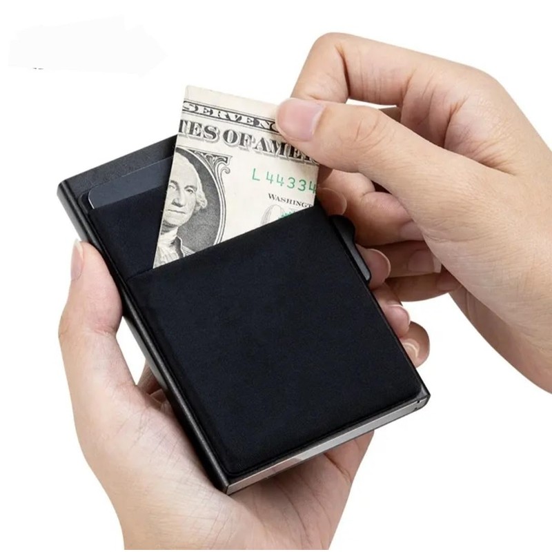 Pop up Card Holder Wallet for Men, RFID Blocking, Slim Business Credit Card Wallet with Money Pocket, Aluminum Metal Bank Card Case for Debit Cards, Notes, and Coins, Black