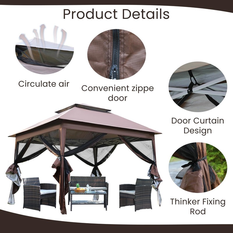 Pop Up Gazebo 10x10 Ft Outdoor Gazebo Tent Easy Setup Patio Gazebo Waterpoof Canopy Tent with Mosquito Netting Zippers Metal Frame for Patio Outdoor Garden Lawn Backyard, Brown