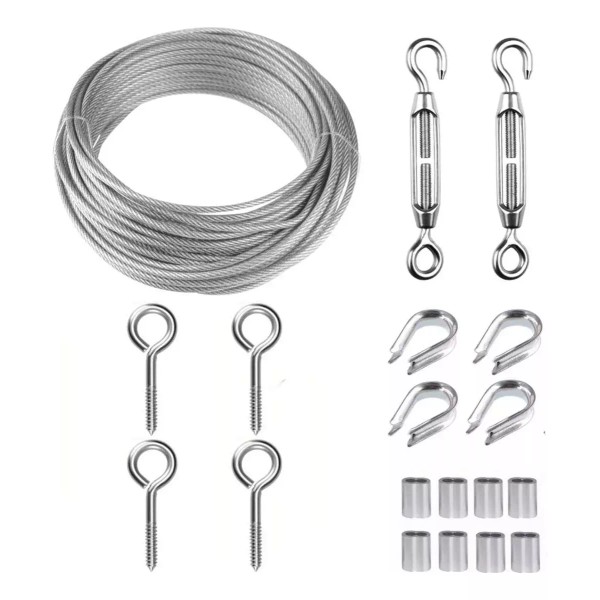 El acero inoxidable 304 es muy resistente a la intemperie y se puede cortar a la longitud deseada; La virola de engarce de 8 piezas y el guardacabos de 4 piezas protegen el cable, reducen el desgaste y prolongan su vida útil.