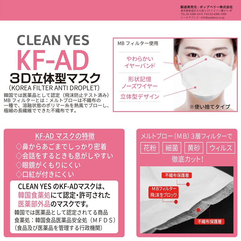 POPBERRY Popberry CLEAN YES KF-AD 3D Mask, Set of 5 x 3, Korea, KF-AD Certified, Kaken Tested