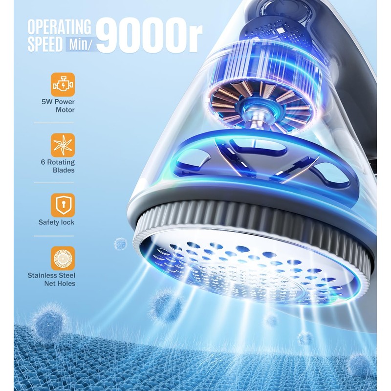 - EFFICIENT & POWERFUL: The sweater shaver with 5W POWERFUL MOTORS spins at nearly 9,000 RPM, it gives you the power for both general garment care and emergency quick fixes. Upgraded 6-leaf 400T3 stainless steel blades and a 2.7-inch shaving head, 60% faster than similar fabric shavers on the market, more powerful and efficient.