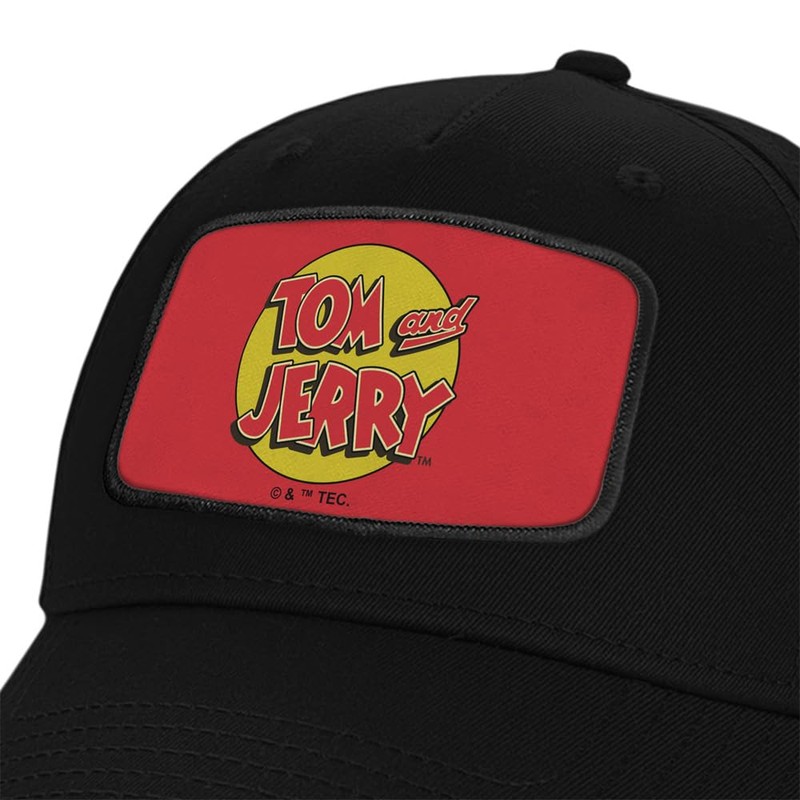 Popfunk Official Tom and Jerry Logo Red Sublimated Patch Adjustable Strapback 5 Panel Structured Hat - Unisex for Men and Women, Black