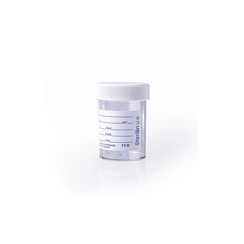 A specimen container for patients when they need to provide a sample for testing. The specimen bottle has a 60ml capacity and comes with a printed label for identification and a plastic cap to seal the sample. Material: Polystyrene Closure Material: Polyethylene Certifications/Compliance: Leak-tested in accordance with BS EN 14254 Annexe D.