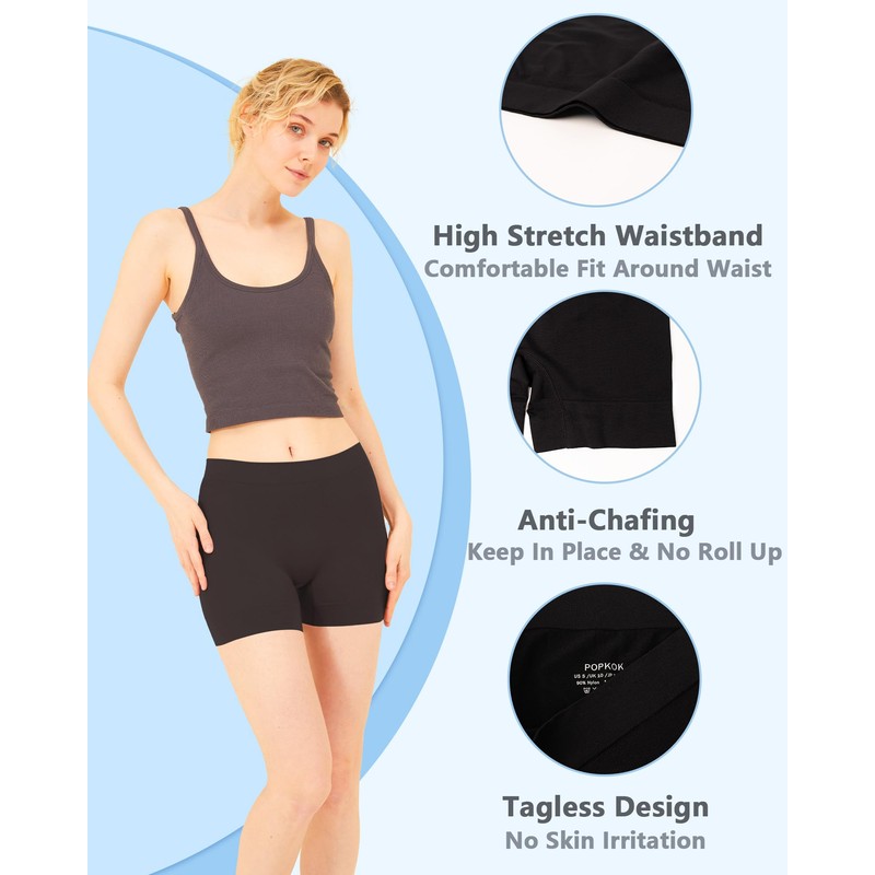 - SIMPLE CLASSIC DESIGN: POPKOK 3 pack womens seamless short slip shorts have a simple classic design with multiple color options and are great gift ideas for ladies. The tagless design also makes the boxer shorts more comfortable and form-fit without digging into the skin or rolling down. As comfortable everyday wear, it works great at home, casual, or sports. It's also a perfect choice for summer wear even during exercise or high-temperature days.