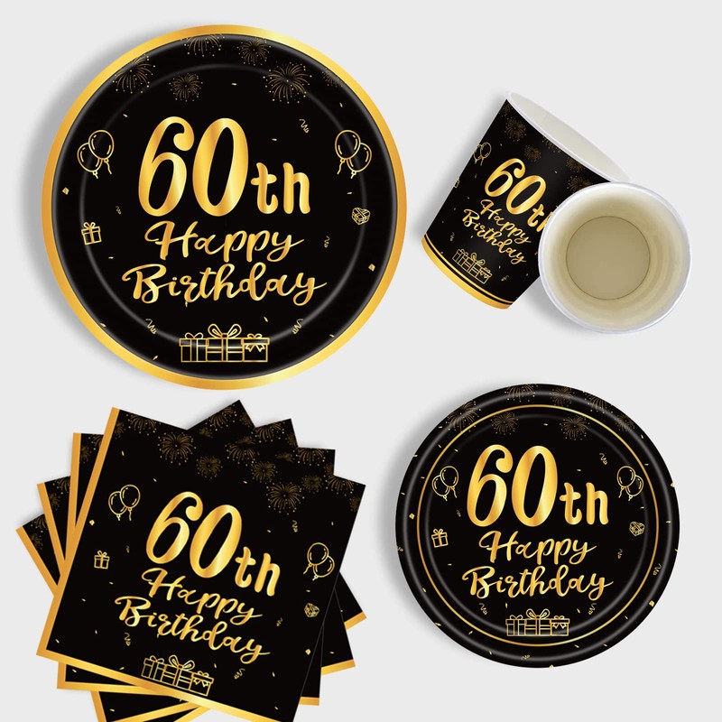 POPOYU 16pcs Black and Gold Paper Plates 60th, Happy Birthday Disposable Tableware Paper Plates 7 Inch,Happy 60th Birthday Decorations Plates for Men,Women,Him,Her 60th Birthday Gifts Party Supplies