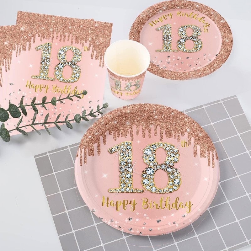 - HIGH QUALITY MATERIAL All of our pink rose gold happy birthday paper tableware are made of high quality paper or plastic, non-toxic, odor free, heat resistant and durable. The patterns and colors are beautifully printed and fade resistant to give you a party full of happy birthday mood.