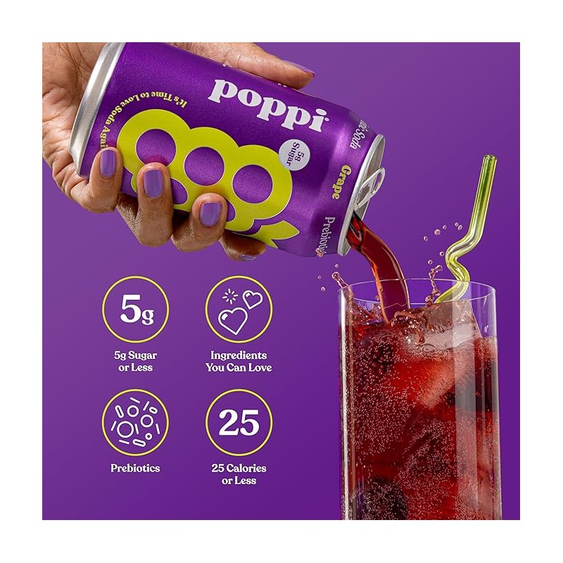 POPPI Sparkling Prebiotic Soda, Beverages w/Apple Cider Vinegar, Seltzer Water & Fruit Juice, Grape, 12oz (12 Pack) (Packaging may vary)