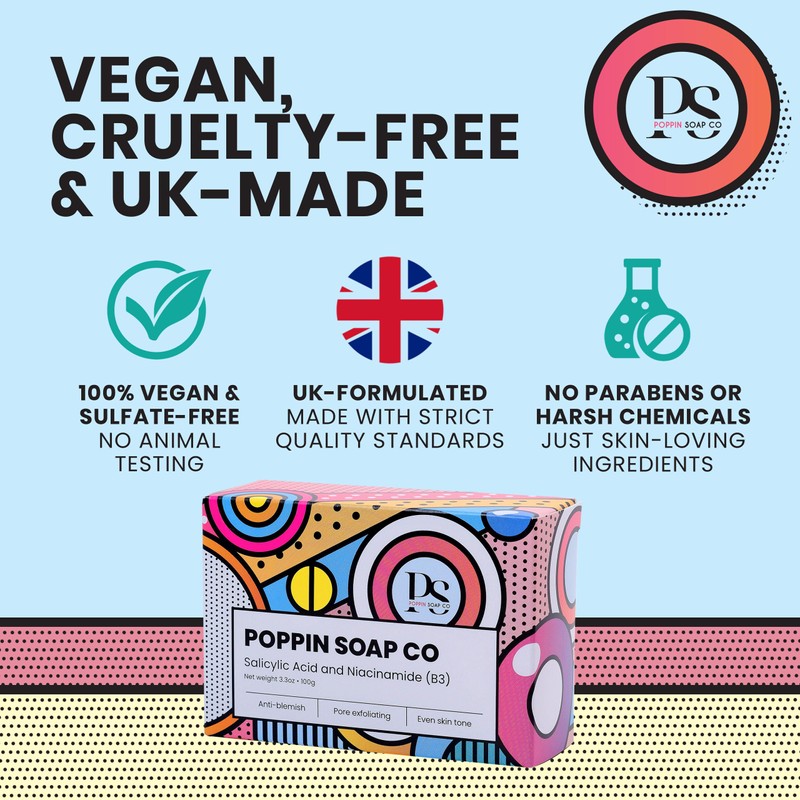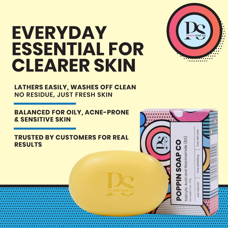 Poppin Soap Co. Salicylic Acid & Niacinamide Face, Back & Body Wash Bar (100g) – Acne Control, Blackhead & Pore Cleansing for Oily, Combination & Blemish-Prone Skin