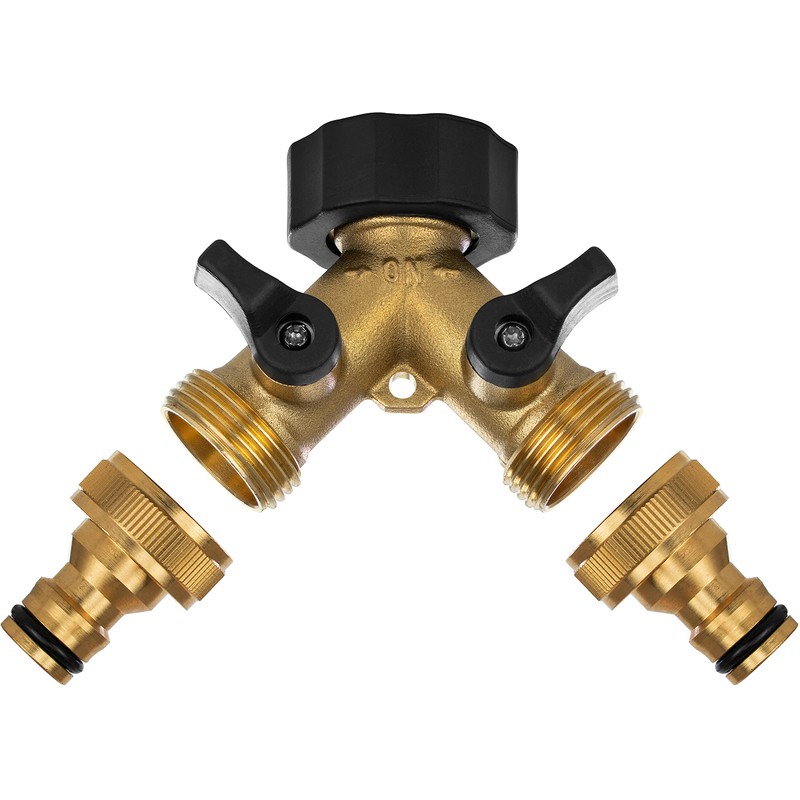 - Box contents: 1x distributor 3/4 inch water tap with shape sealing ring and independent on/off valves, including 2x hose coupling, brass