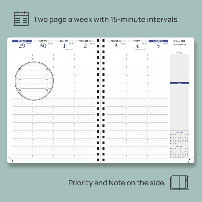 - EFFICIENT WEEKLY LAYOUT: One week per two page spreads in column-style starting from Sunday to Saturday. Quarter-hourly appointment times for every day are from 7: 00 a.m to 8: 30 p.m so that you can arrange your life for school or work easily.