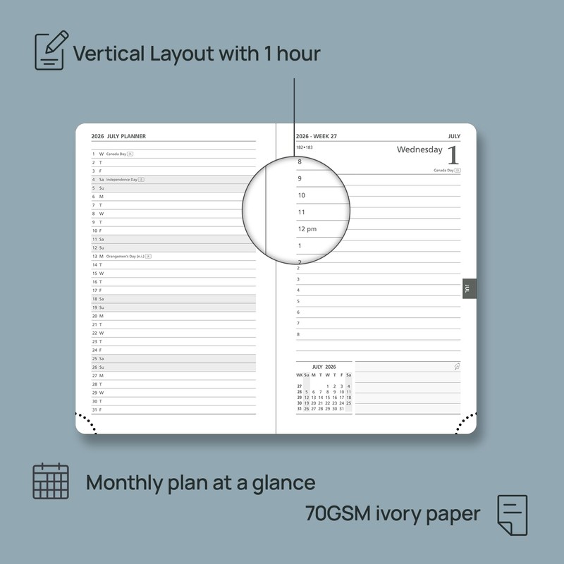 - FULL PAGE PER DAY EVEN WEEKENDS: This daily dairy 2026 features 365 daily pages, which presents spacious space for hourly schedules from 7 AM to 8 PM. Besides, each page has a monthly overview with lined space for notes on the bottom side. It keeps your busy daily routines organized.
