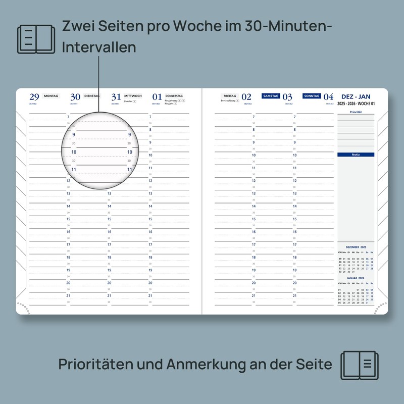 - Weekly plan/monthly plan: the 1-week, 2-page weekly calendar provides a complete and clear weekly overview (from Monday to Sunday). Each monthly plan includes a monthly overview and a notes section.