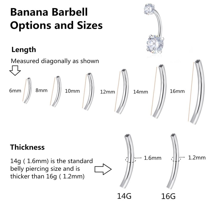 - Sold Individually. Size: Bar Thickness: 14G(1.6mm) Bar Length: 10mm(25/64”), Top CZ: 5mm, Bottom CZ: 8mm This is an Internally Threaded belly ring which features a round CZ gem at the top and bottom of the jewelry, giving it a very beautiful and sparkly outlook. Suitable for different occasions.High quality titanium, not easy to deform, healthy for those who are sensitive to other metals.