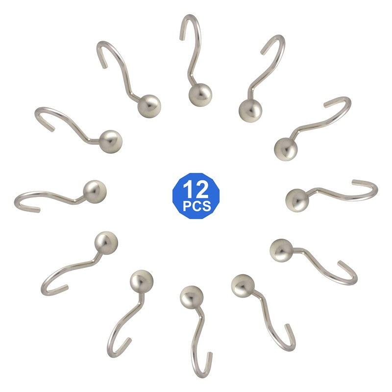 - Elegant Metal Ball Shower Hooks consists of a set of 12 shower hooks. Universal fit can be used with any existing shower rod. This sleek and modern design will add a fresh clean look to any bathroom space. Durable and functional hooks. Contains a single ball at the end of each curtain hook which hangs smoothly over the hanging rod without bunching.