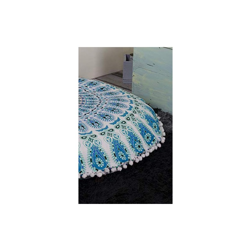 Popular Handicrafts Floor Pillow Cushion Cover - Hippie Mandala Cushion Cover Large with Pom Poms Soft Particles - Pouf Cover Round Bohemian Yoga Decor, 24" White Teal Green