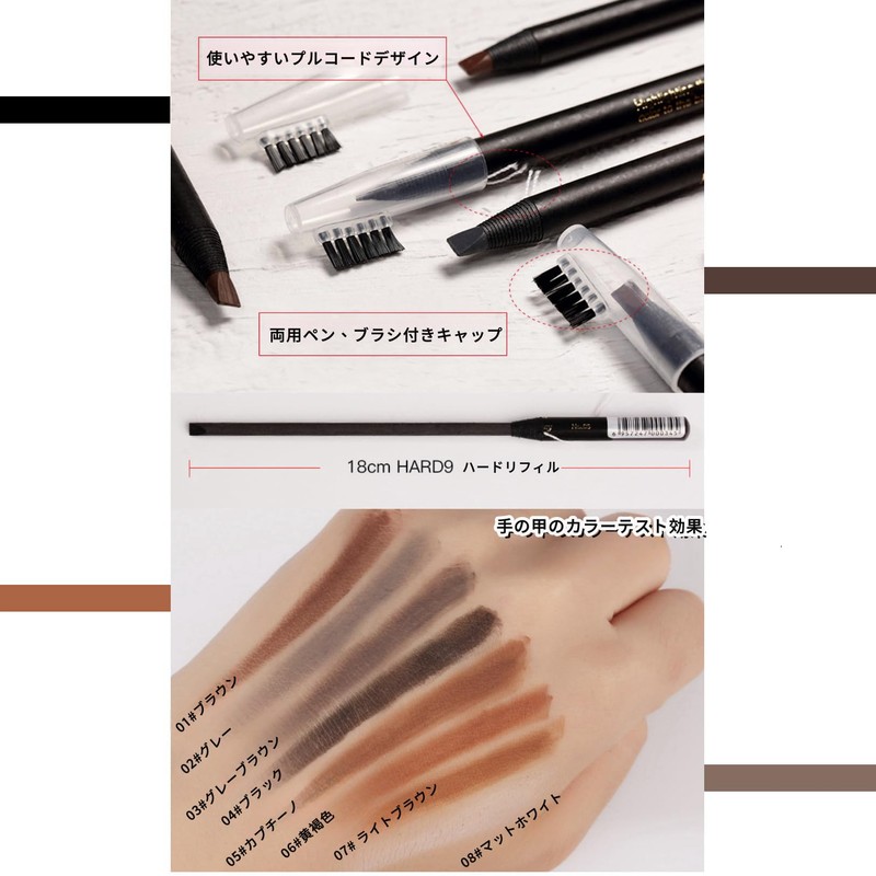 - (Pencil Hardcore Eyebrow Pencil) The brow pencil edge is used to create precise and thin lines as thin as a hair. Use the sides of the eyebrow pencil to create a natural eyebrow style or bold eyebrow style. Eyebrow pencil tips are used to fill the fine gaps between eyebrows. Create beautiful and delicate makeup easily and naturally