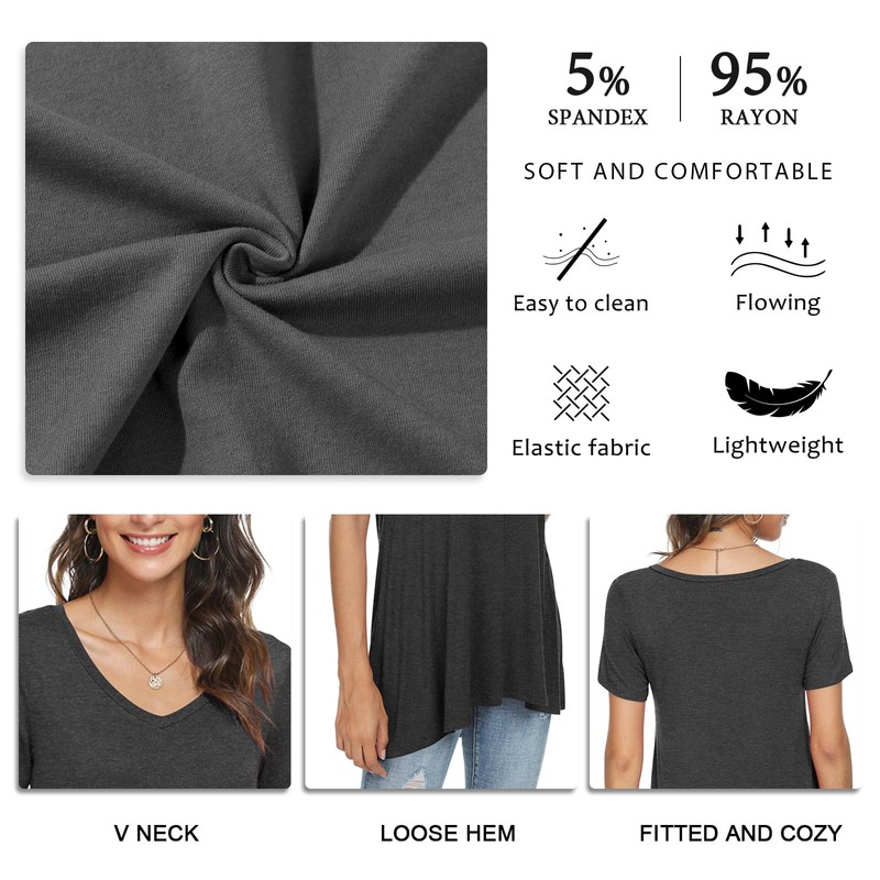 - Material: This basic tunics tops is made of 95% Rayon plus 5% Spandex. It is soft, comfortable, stretchy, light-weight. Machine wash and they dry quickly with little or no ironing, no shrinkage.