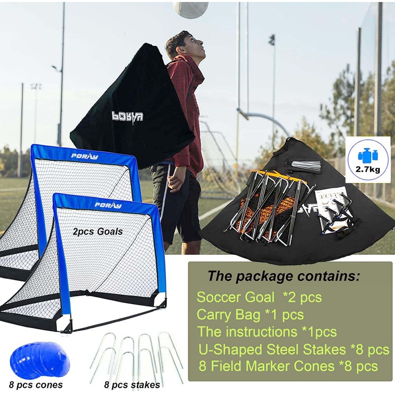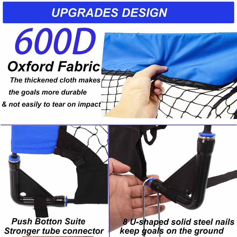 - ✔️⚽DESIGN UPGRADES - the support Angle on both sides of the joint use of the latest developed push button bite suite (patent applied for ), the whole framework more strong after assembly, stronger resistance to impact, eight solid stainless steel nail grip is stronger on the ground,using 600 D Oxford thickening cloth, interface suture closer, the use of the net durable polyester material, the net all upgrade design make our soccer goal more perfect. I'm sure you'll like it.