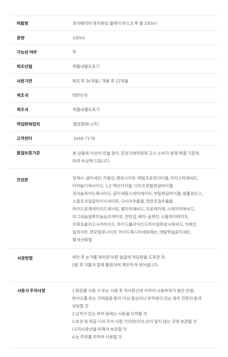 Pore Barrier Purifying Clay Mask to Foam 100ml / 포어베리어 퓨리파잉 클레이 마스크 투 폼 100ml