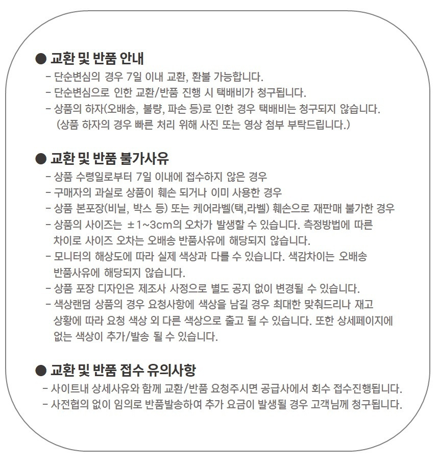 본 제품을 구매하시면 원활한 배송을 위해 꼭 필요한 고객님의 개인정보를 (성함, 주소, 전화번호 등) 택배사 및 제 3업체에서 이용하는 것에 동의하시는 것으로 간주됩니다.