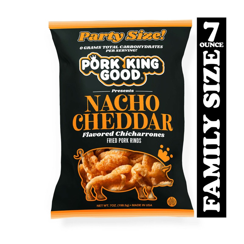 You asked for bigger, and we're giving you huge! Share the Pork-King love with our family size bags of chicharrones! These family sized bags are filled with our Nacho Cheddar Pork Rinds, featuring the familiar flavor of a cheesy plate of piled high cheesy nachos - but without the guilt!Nutritional Info: