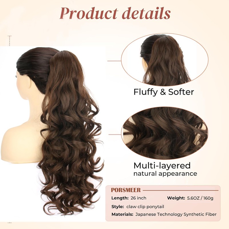 PORSMEER Ponytail Hair Extension Claw Clip in Ponytail Extensions Long Curly Wavy Ponytail Hair Extension Jaw Clip on Pony Tails Hairpiece for Women 26 inches (Brown)