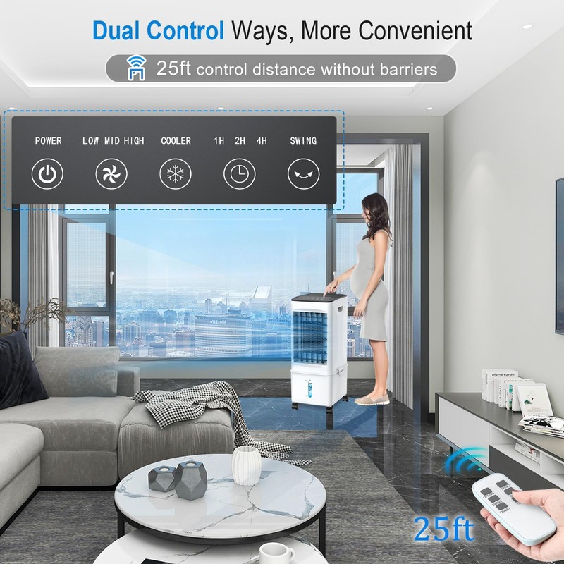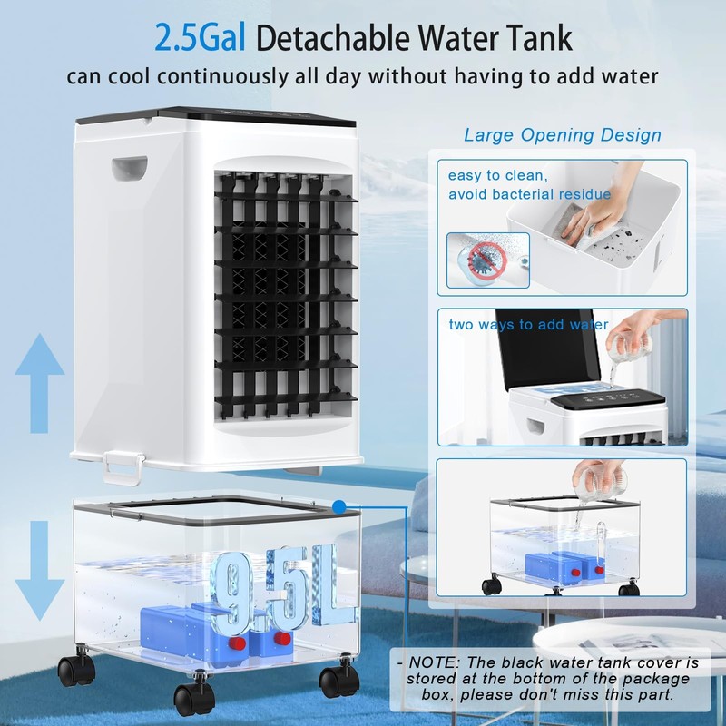 - 9.5L & Two Ways To Refill - Enjoy the convenience of the larger water tank! Once filling can cool for more than 24 hours. Keeps the air fresh but not dry. Adding water on the top is very friendly to the elderly, pregnant women or those with waist injuries. Morever, if you add ice packs to both the top and bottom tank, you will get double the cooling effect!