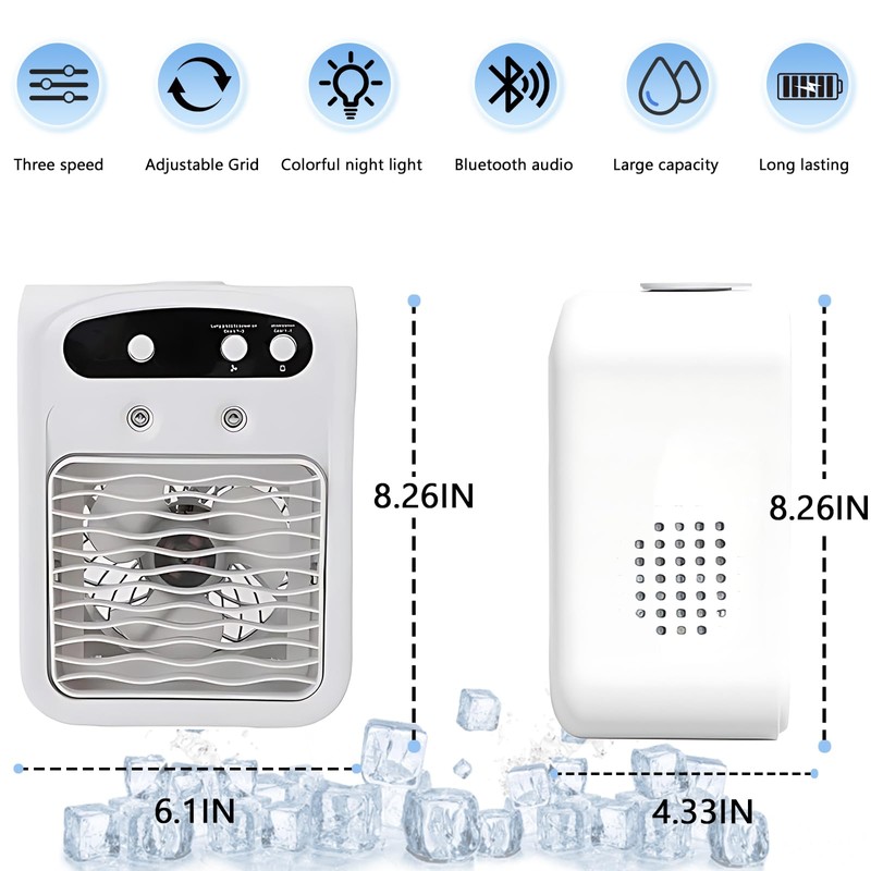 - 4in-1 Mini Air Conditioner -- Our air cooler is not just a personal air conditioner, but also serves as a desk fan, air humidifier, Bluetooth speaker,and night light. It brings you cool, moist, and comfortable air, making your room more comfortable year-round. The mini evaporative cooler is perfect for escaping the heat and can be used in any season.