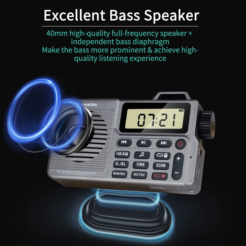 Portable AM/FM Radio, Small Pocket Radio with Bass Speaker, Support Micro SD Card and Record, Long Battery Life, Alarm and Sleep Function