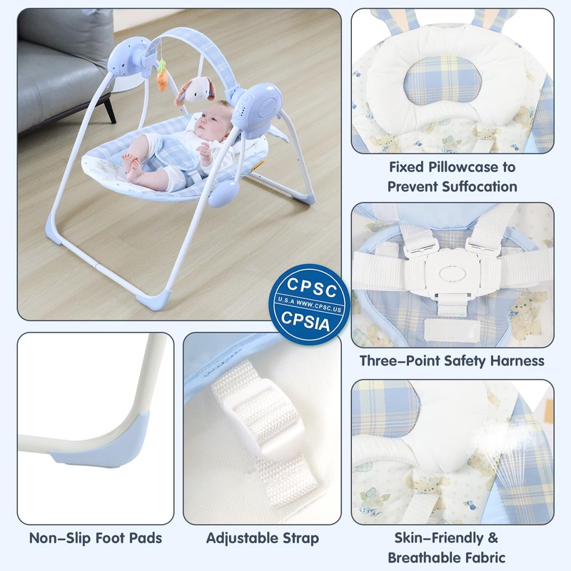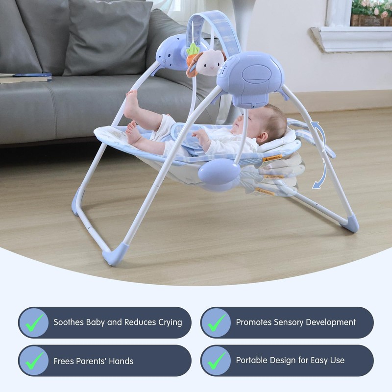 - Soothing Sounds & Engaging Toys:Built-in 6 soft melodies with 3 volume levels create a calm environment for your little one. The removable toy bar includes soft plush toys to help develop hand-eye coordination. Baby swing with music, infant swing with toy bar, baby sensory toy.