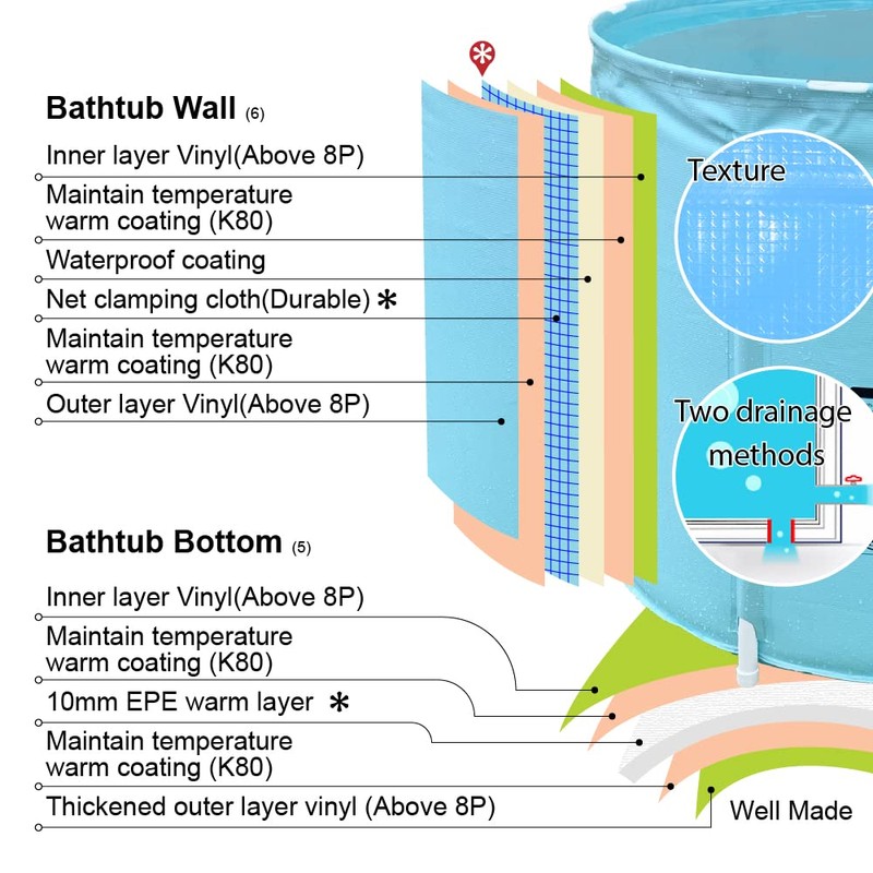 - Environmentally friendly and Durable: The fabric of the portable bathtub is 0.6mm Net Clamping Cloth material, and the bottom of non-inflatable tub is two PVC with the 10mm sponge. Imported Non-toxic PVC meet quantity test standard, environment-friendly and durable, so you can enjoy the bathtub without any worry.
