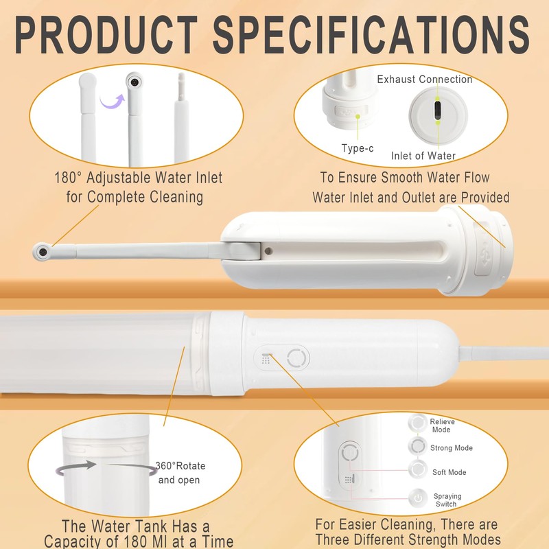 - The USB rechargeable bidet offers three spraying modes—Relieve, Strong, and Soft. Its 180-degree rotatable nozzle guarantees thorough, comfortable cleaning every time.