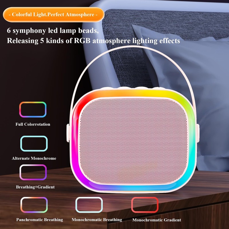 • 🔔【Mini Karaoke Machine Portable and Fun Design】Kids karaoke machine colorful LED lights (6 modes) that dance to the music. karaoke machineleather wristband for freely taking anywhere, very portable and compact. Birthday parties, Conferences, Classes, Outdoor activities etc. keeping your kids, friends or family entertained and engaged all night long. This portable Bluetooth speaker and wireless microphone will satisfy all your "happy singing" needs.