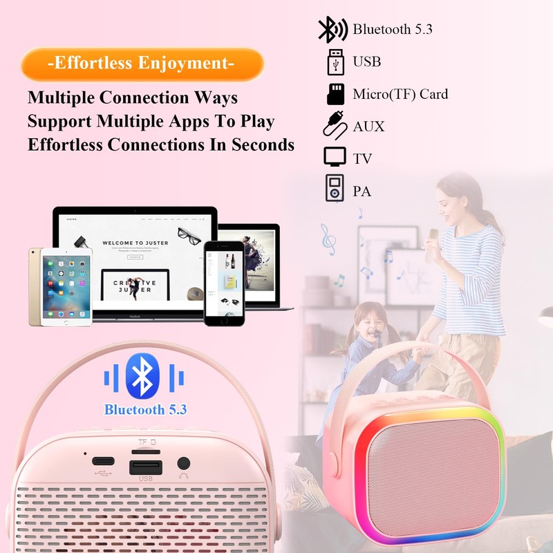 • đŸŽ¶ă€Multi functional Kids Karaoke Machine】This karaoke machine for kids has powerful functions. Karaoke machine, portable speakermusic player, karaoke bluetooth and party lights all in one! Kids can effortlessly pair with smartphones, tablets, and other devices with just one touch, reaching up to 32 feet away. Additionally, they can play music from USB drives, TF cards and even utilize the AUX IN function.