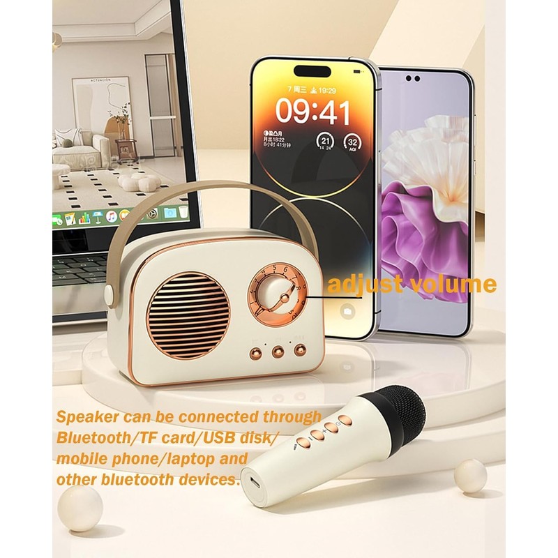 - Features: Bluetooth speaker comes with 2 wireless microphones. Speaker can be connected through Bluetooth, TF card, USB disk, mobile phone, laptop and other bluetooth devices. Meanwhile, speakers can be used for hosting, speeches, and teaching.