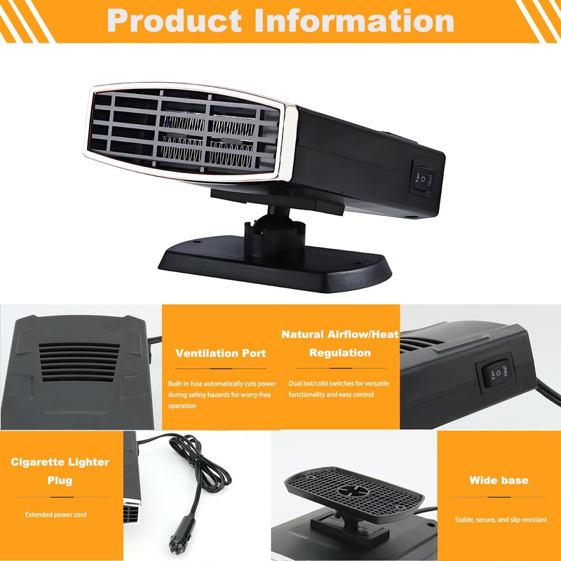 • 【Cold and Warm Dual Use】Our 12v portable car heater is available all year round.This car heater portable is not only ideal for demisting/defrosting windscreens.but it can also be used as a cooling fan in summer.The unique 360° rotatable bracket allows you to adjust the air outlet to any angle, ensuring optimal heating or cor defrosting the car window