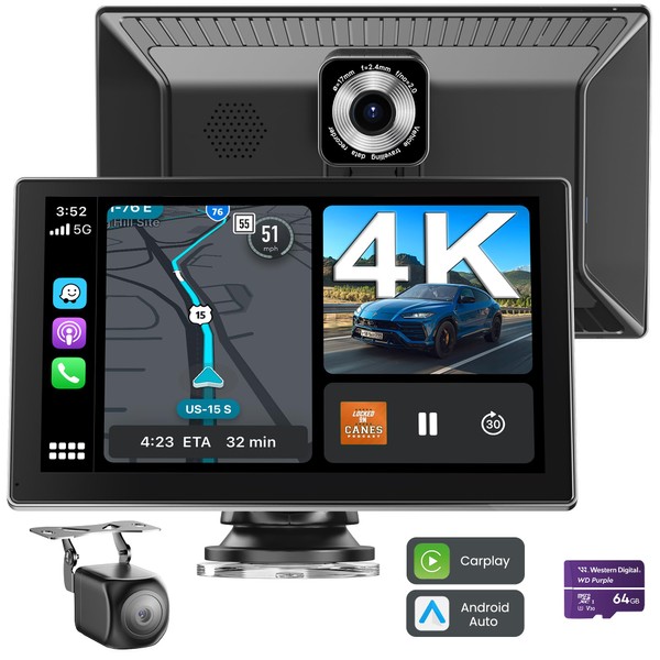 Portable CarPlay Screen for Car, 9'' Wireless Apple CarPlay & Android Auto Screen for Car, 4K Dash Cam, 1080P Backup Camera, GPS Navigation/Bluetooth/FM/Siri Voice Control for All Vehicles