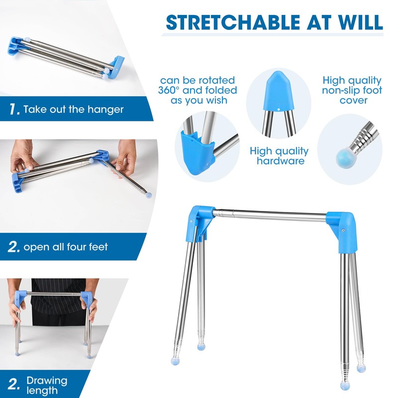 - High-quality material: portable hanger made of stainless steel, sturdy and durable. With a sturdy triangular structure, four non-slip and wear-resistant rubber sleeves are attached to the bottom. It provides better grip, is stable and is not easy to shake or fall.