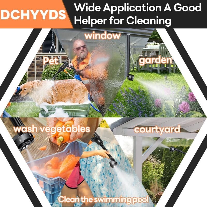 - 【Cordless High Pressure Washer】 DCHYYDS cordless power washer is designed with a high-quality metal pump head and an all-copper motor, offering a powerful 600 PSI cleaning pressure and a flow rate of 270 liters per hour. It is an ideal portable battery pressure washer that allows you to easily and quickly clean your car, fences, floors, and more!