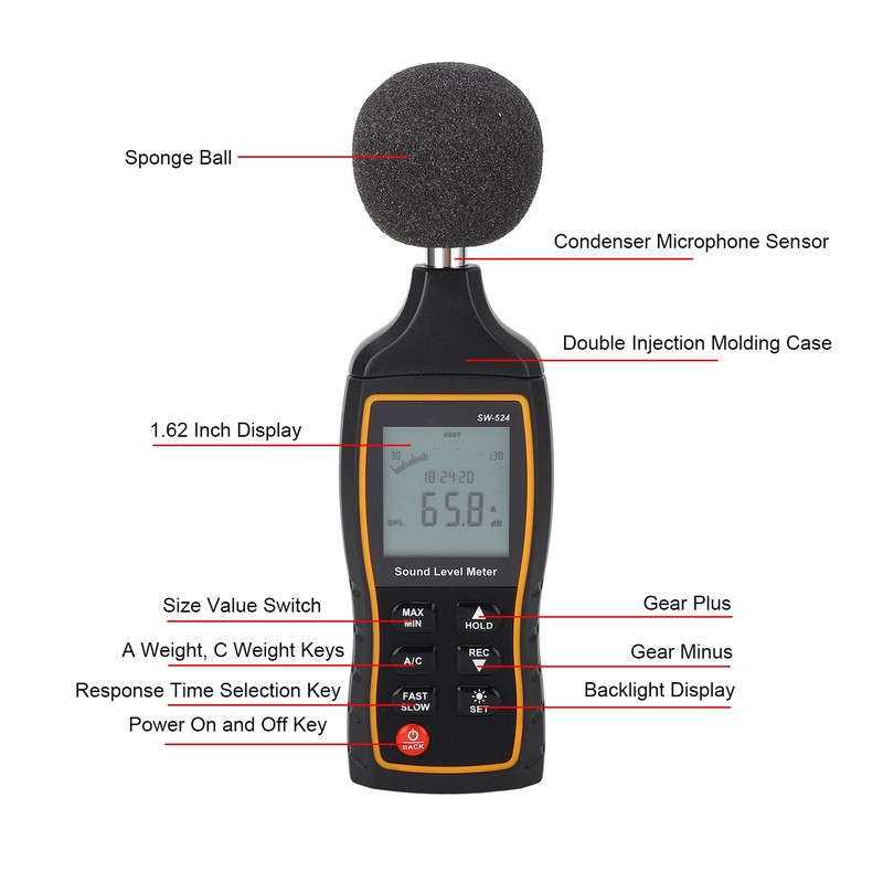 - Good Performance: This sound level meter responds in fast mode within 125 milliseconds and in slow mode within 1 second, with a +/‑ accuracy of 1.5 dB and a resolution of 0.1 dB. the frequency range is from 30 Hz to 8 KHz (the frequency is not digitally displayable on the screen).