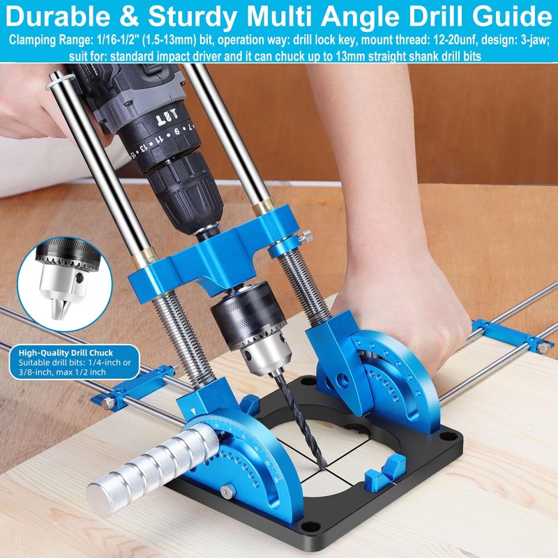 Portable Drill Guide, Multi Angle Drill Guide for Straight Holes, Self-Centering Pins, Drilling Jig w/Chuck & Key, Adjustable Angle from 0° to 60°, Chuck Clamping Range for 1/16-1/2" (1.5-13mm)
