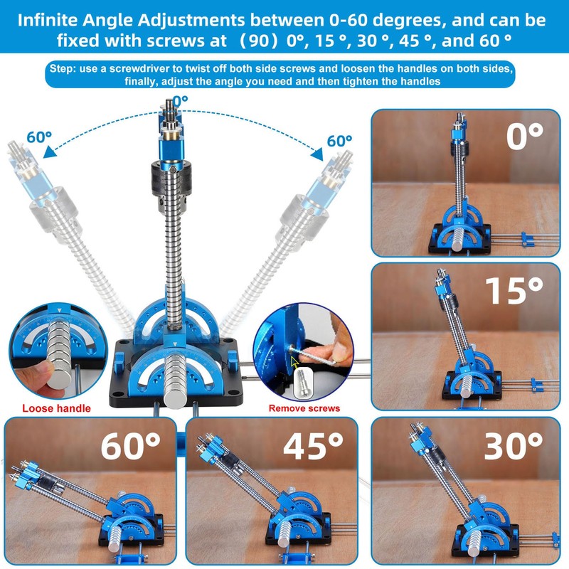 - ❤.【Product Features】: Adjustable Angle: infinite angle adjustments between 0° and 60° for drilling, and can be fixed with screws at (90)0°, 15 °, 30 °, 45 °, and 60 ° | suggestion: 1: after adjusting the angle be sure to tighten the handle; 2: when adjusting the angle to between 30-60 degrees, it is recommended to screw the holes at the four corners of the base to make the machine more stable to use; depth stop ring: the depth stopper allows you to drill to the same depth again and again