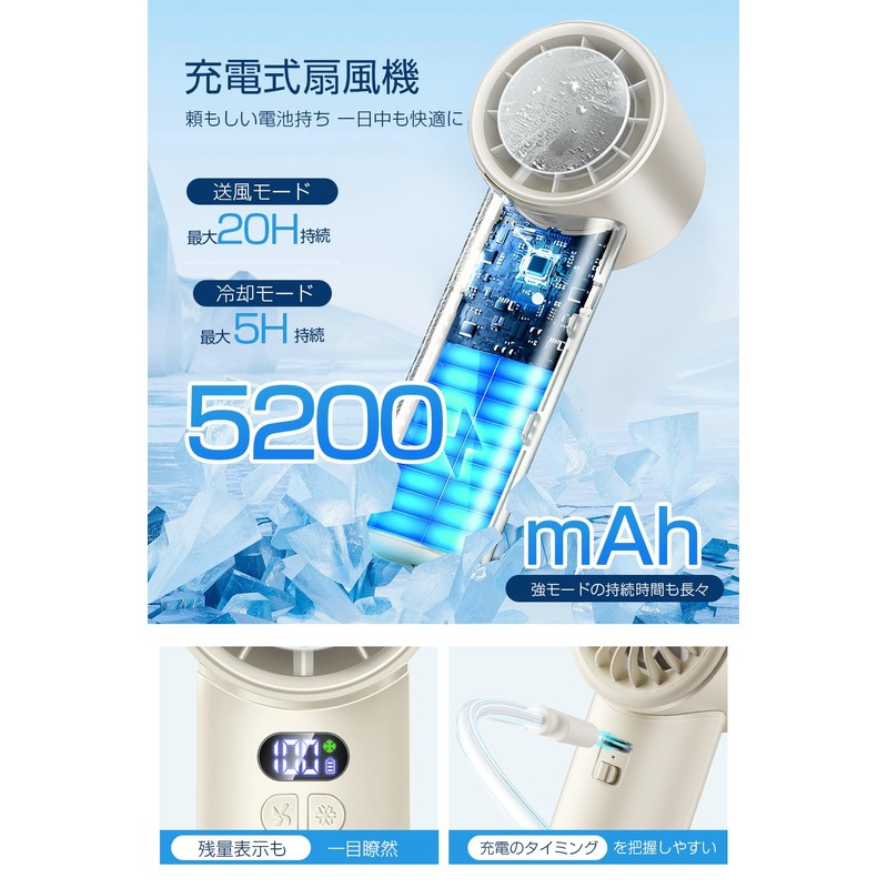 - (Rechargeable Fan with Display Display) Built-in 5,200 mAh high capacity battery that supports various charging methods such as a computer, charger, AC adapter, etc., and supports continuous use for a long time. With a single full charge, it can be used for up to 20 hours of continuous driving, so you can use it easily when going out or on the go. In addition, the remaining battery level, each level of air flow, and cooling mode are clearly displayed on the LCD screen, making it easier to understand when used and when charging